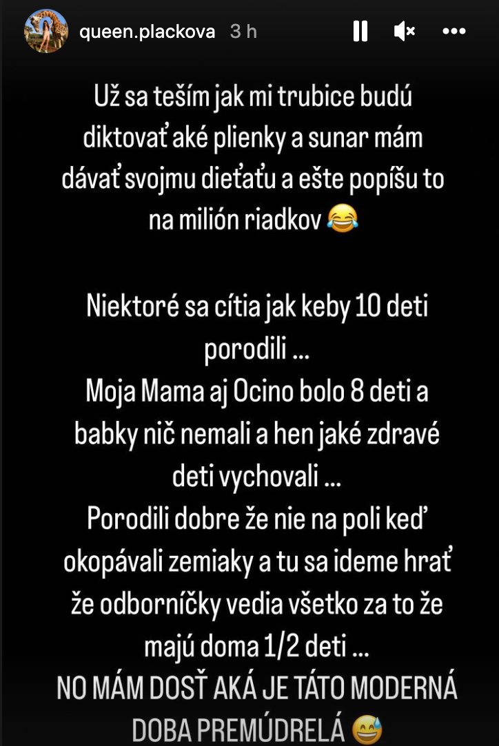 Ale je to jej voľba a zaradí sa tak medzi celebrity ako sú manželia Vrbovskí, Cifrovci či Pocisková s Tůmom a ďalší, ktorí svoje deti na sociálnych sieťach jednoducho neukazujú. "Samozrejme, budem vám ukazovať nejaké tie vecičky, čo uznám za vhodné, lebo vás tu mám viac precent tých normálnejších, ktorí sa na to tešíte, takže určite nebudete pykať za nejaké blbky," spoň trošku sa Zuzana snažila utešiť sledovateľov, ktorým vďačí za veľa. Stačí si počkať už len necelé dva mesiace a bude jasné, či Plačková odolá pokušeniu pochváliť sa svojím prvorodeným dieťatkom.