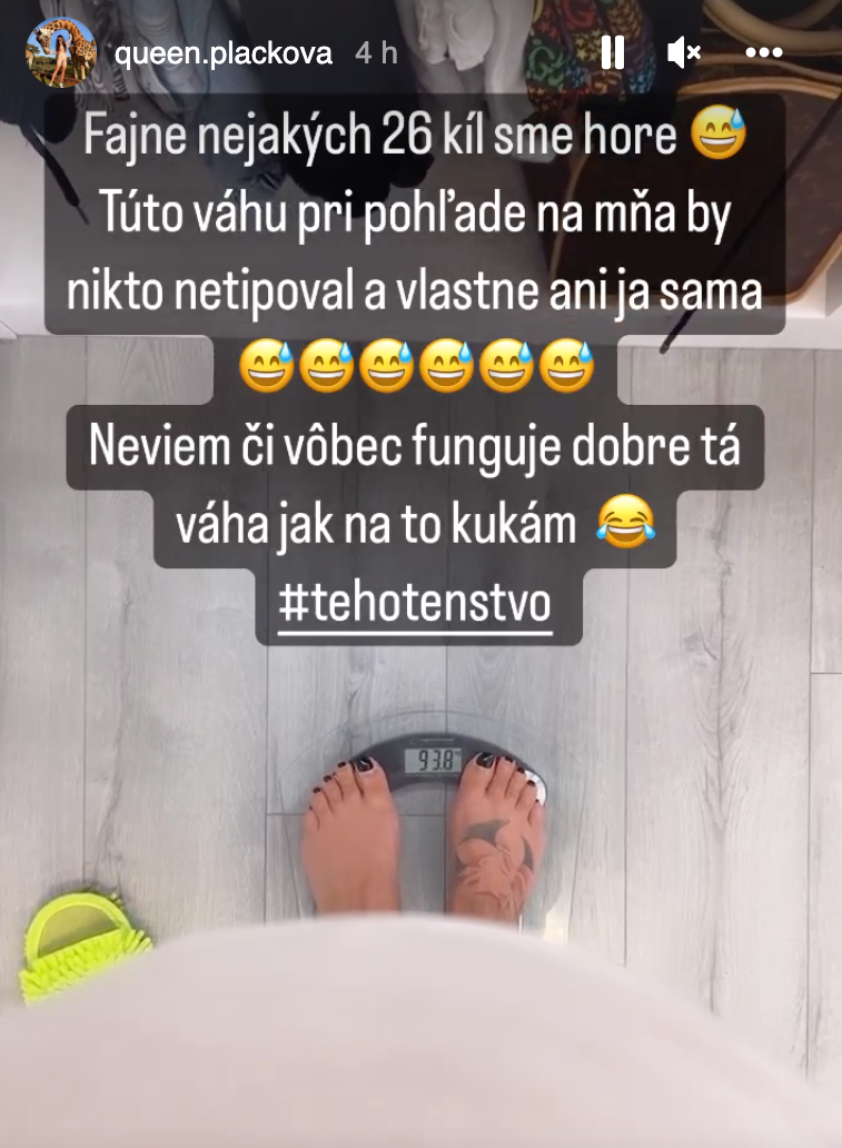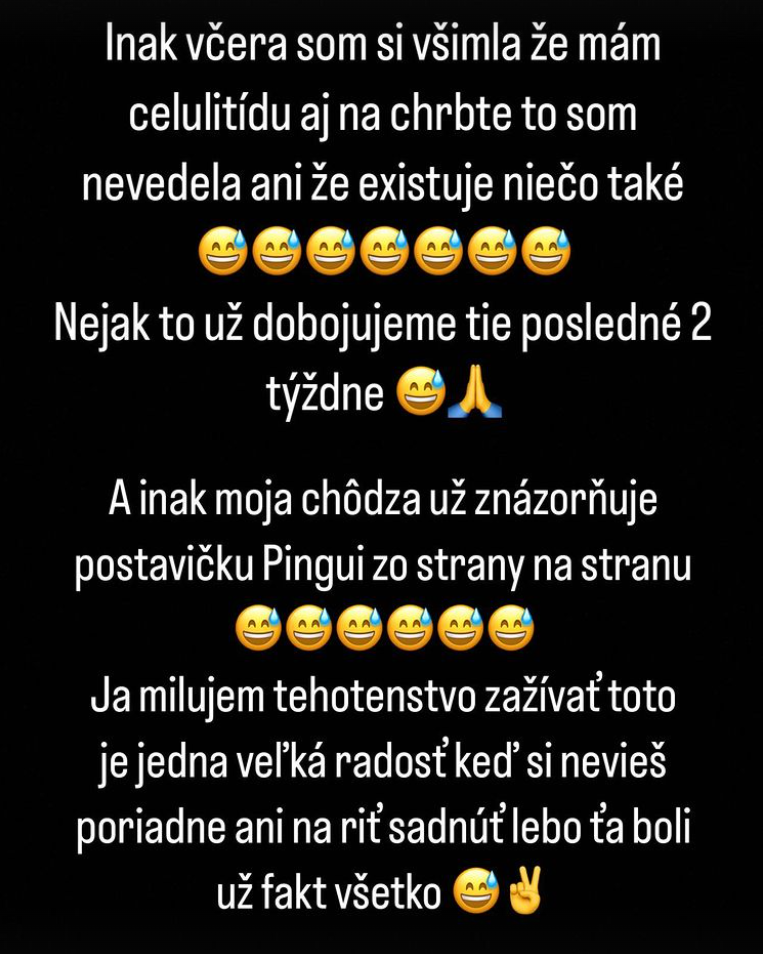 Najťažšie sú aj preto, že nastávajúce mamičky sú najťažšie. Pochopiteľne, nie všetky priberú rovnako, niektoré viac iné menej, no aj tak je tehotenstvo pre organizmus a telo obrovská záťaž. To už vie celkom presne aj Plačková, ktorá patrí k ženám, ktoré pribrali nadpriemerne. "Včera som si všimla, že mám celulitídu aj na chrbte, to som ani nevedela, že existuje niečo také," napísala úprimne.