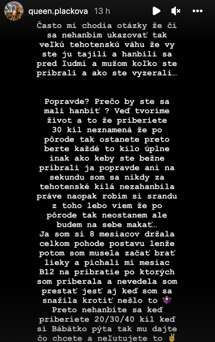 Nastávajúca mamička ale prekvapila priznaním, čo je za jej rapídnym priberaním v posledných týždňoch. "Ja som si 8 mesiacov držala celkom v pohode postavu, lenže potom som musela začať brať lieky a pichali mi mesiac B12 na pribratie, po ktorých som priberala, a nevedela som prestať jesť, aj keď som sa snažila krotiť, nešlo to," objasnila svoju situáciu. Ktovie, či to súviselo s jej júnovou hospitalizáciou, keď jej zistili ťažkú anémiu. Kým vtedy bol dôvod na obavy, ako sa podarí tehotenstvo v zdraví dotiahnuť, teraz už tento problém odpadol. Už len bezproblémovo porodiť zdravé dieťatko a tešiť sa z prívalu nepoznanej lásky.