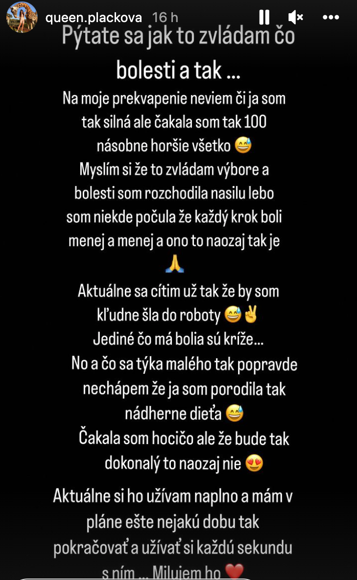 No ako je už zrejmé, fanúšikom influencerky neostáva iné, ako sa spoľahnúť na jej slová. Hoci instagram zaplavuje príspevkami s malým, na jeho tváričke je vždy smajlík. No Plačková vopred avizovala, že to tak bude a svojho syna na sociálnej sieti nikdy neukáže. No na veľkú radosť jej priaznivcov, zatiaľ nenastal moment, žeby sa od Instagramu odpojila, ako tvrdila. Je ale možné, že tak spraví až po návrate z pôrodnice, čo by mohlo byť v utorok či v stredu. Ak by to trvalo dlhšie, bol by to signál, že niečo nie je v poriadku, Snáď sa nič také nestane.