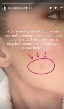 Po náleze nádoru sa vraj musela urýchlene podrobiť operácii. Nebol to u nej ale prvý nález, keď mala 19 rokov, museli jej odstraňovať z chrbta melanóm, veľmi agresívnu formu kožnej rakoviny. Khloé sa rozhodla, že po týchto skúsenostiach s rakovinou bude robiť pre svojich 276 miliónov sledovateľov osvetu. To lekárka Tess Mauricio, certifikovaná dermatologička, ktorá ju vyšetrovala, veľmi kvituje, lebo tým pomáha zvýšovať povedomie o rakovine kože. Robila jej aj prvú biopsiu z dvoch, ale nechcela v rámci lekárskeho tajomstva bližšie špecifikovať prípad jej slávnej pacientky a ani to, o aký typ rakoviny ide. "Zdieľam s vami tento príbeh len preto, aby som všetkým pripomenula, že sa majú dať vyšetriť, a to často," vysvetlila Kardashian sledovateľom s tým, že aj ľudia, ktorí nie sú náchylní na melanóm ako ona, "by sa mali kontrolovať stále".
