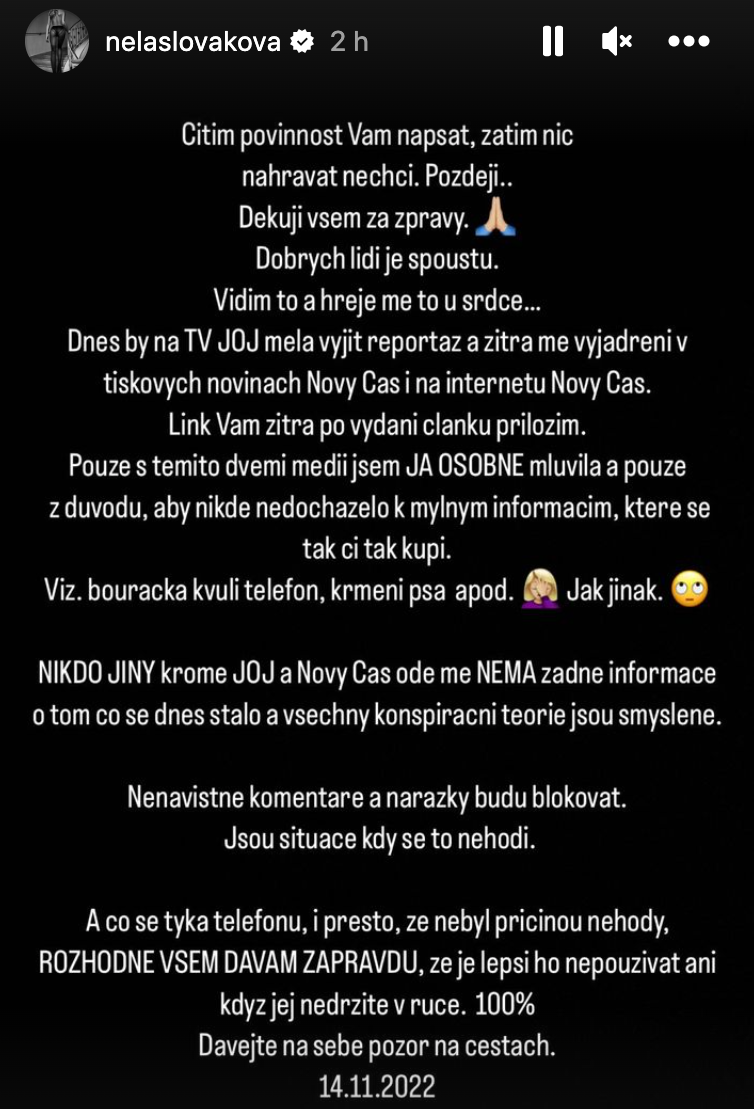 Necelé dve hodiny pred nehodou Nela zdieľala videjko spoza volantu na cestu zahalenú hustou hmlou. Pochopiteľne, mnohí si preto mysleli, že príčinou nehody bude nepozornosť spôsobená tým, že sa Nela venovala mobilnému telefónu. Influencerka sa pre TV JOJ vyjadrila, že v žiadnom prípade netelefonovala. "Padlo niečo z auta predo mnou na cestu. Ja som prudko zabrzdila. Auto sa mi rozvibrovalo, začalo mi hádzať zadkom, hodilo ma to do ľavej strany na zvodidlá a tie ma odpálili do prava do kamiónu," uviedla Slováková.