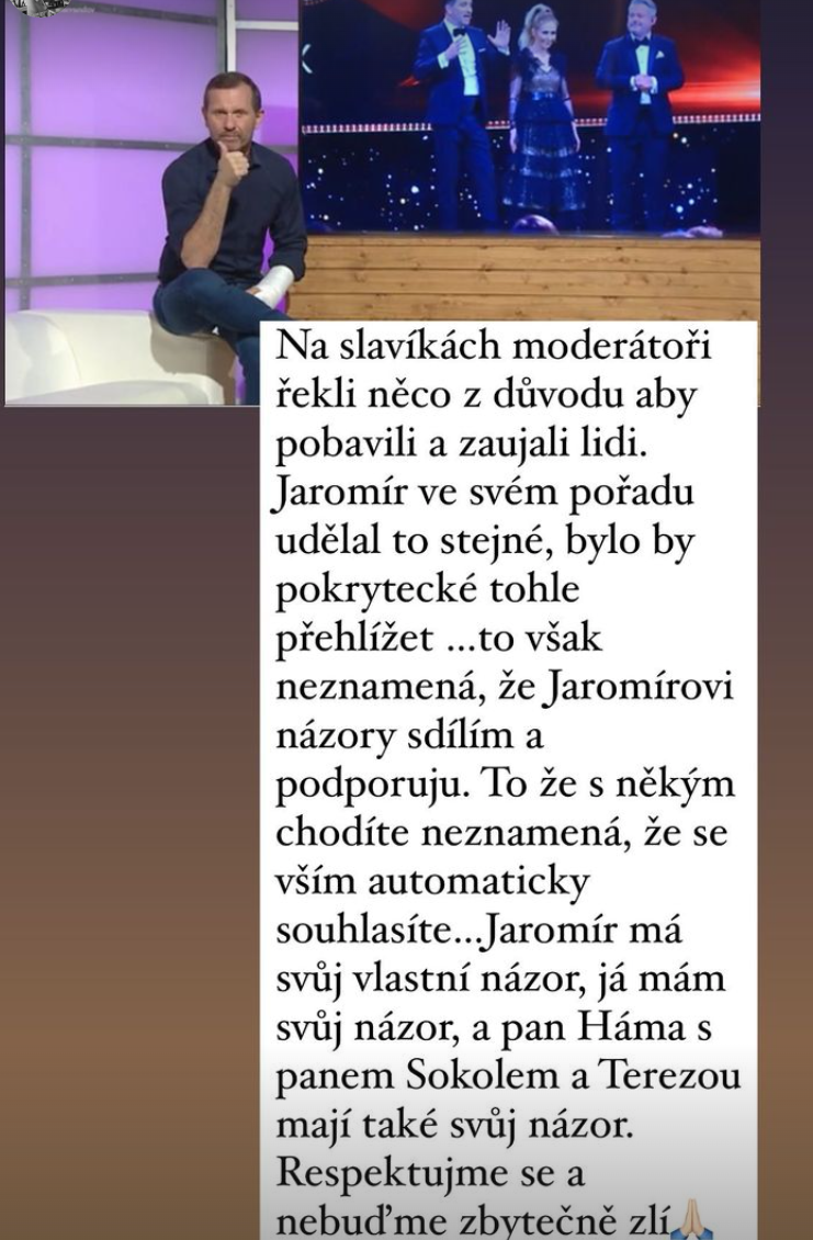 Medzi Soukupom a moderátormi večera odovzdávania českých Slávikov vznikla poriadana slovná prestrelka, Agáta sa však od názorov svojho milého dištancuje. Takto reagoval Aleš Háma na Instagrame: