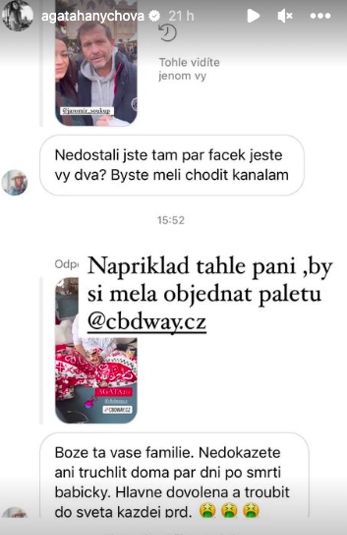 Svoje kritické námietky rozšíril niekto aj na celú Agátinu rodinu."Bože, tá vaša família. Nedokážete ani smútiť doma pár dní po smrti babičky. Hlavne dovolenka a trúbiť do sveta každý prd," zamoralizovala daná osoba, akoby na smútenie boli nejaké pravidlá. Skôr bolo rozumné, aby sa tehotná Agáta netrápila smútkom doma, kde jej všetko pripomínalo babičku. Tentokrát si ale Hanychová povedala, že stačilo, a hlúpe komentáre zverejnila aj s menami ich autoriek. Ako to už býva svet sociálnych sietí je krutý a niet pochýb, že dané "hejterky" si to zlízli v správach od Agátiných fanúšičiek, ktoré sa ňou stoja.