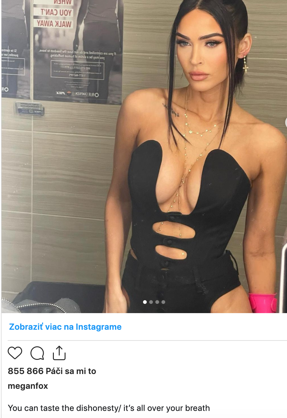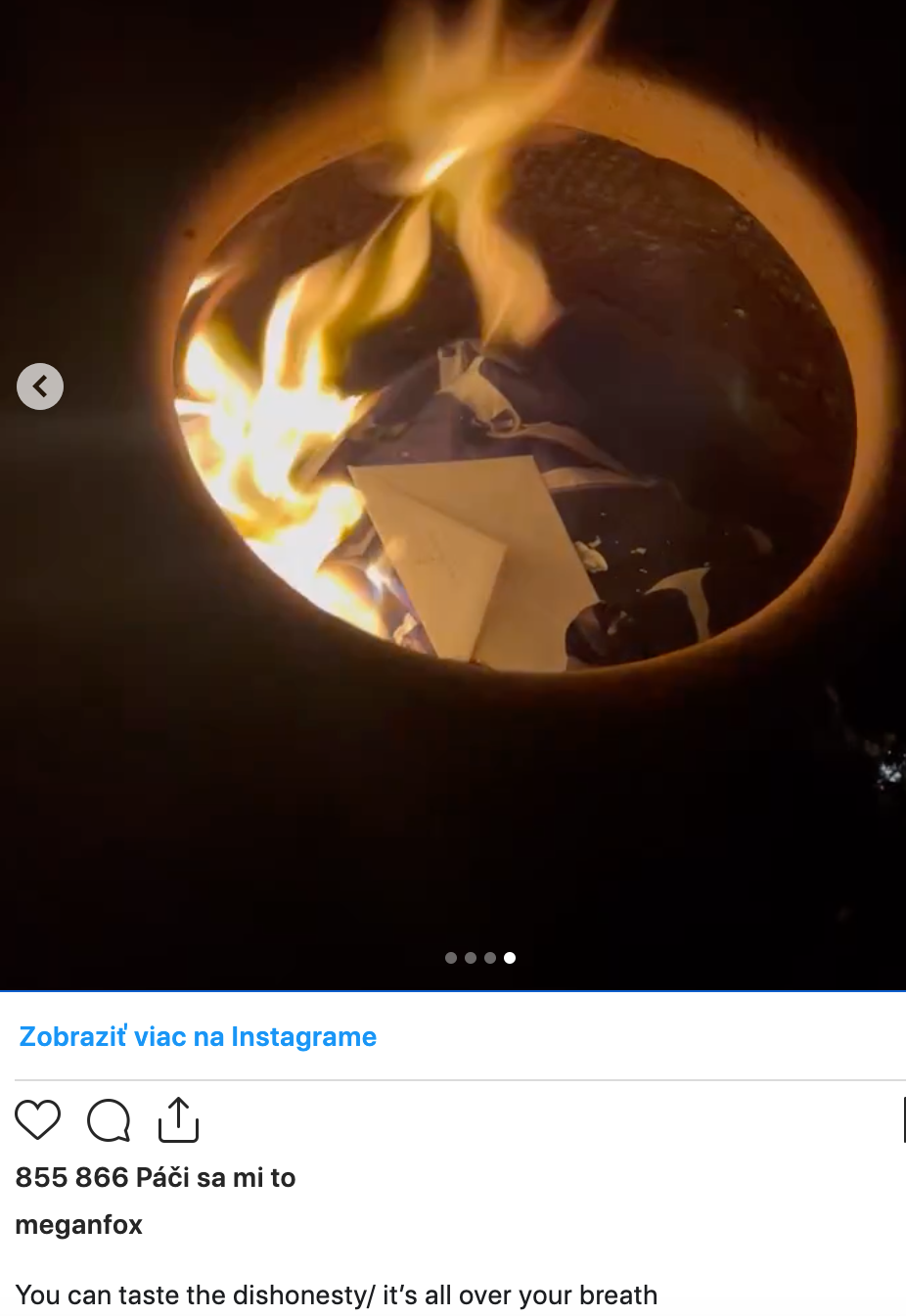 Neprajníci sa pýtajú, či si táto hviezda z Transformers vôbec nájde dostatok času na svoje tri deti, keď na sociálnej sieti stále rieši život s Machine Gun Kellym. Po ich účasti na párty pri príležitosti Super Bowlu, ktorú v Arizone organizoval raper Drake, v sobotu večer zo svojho instagramového profilu vymazala všetky fotografie MGK a zverejnila v komentári hovoriaci o nečestnosti a video, v ktorom pálila akési listy. "Môžeš ochutnať neúprimnosť, je v tvojom dychu," napísala v príspevku, ktorý ale neskôr zmazala, a zmizol dokonca aj komplet jej profil na Instagrame. Megan použila rovnaké slová ako Beyoncé vo svojom hite z roku 2016 Pray You Catch Me. Tá sa vtedy vyspievala o nevere jej manžela Jay-Z.