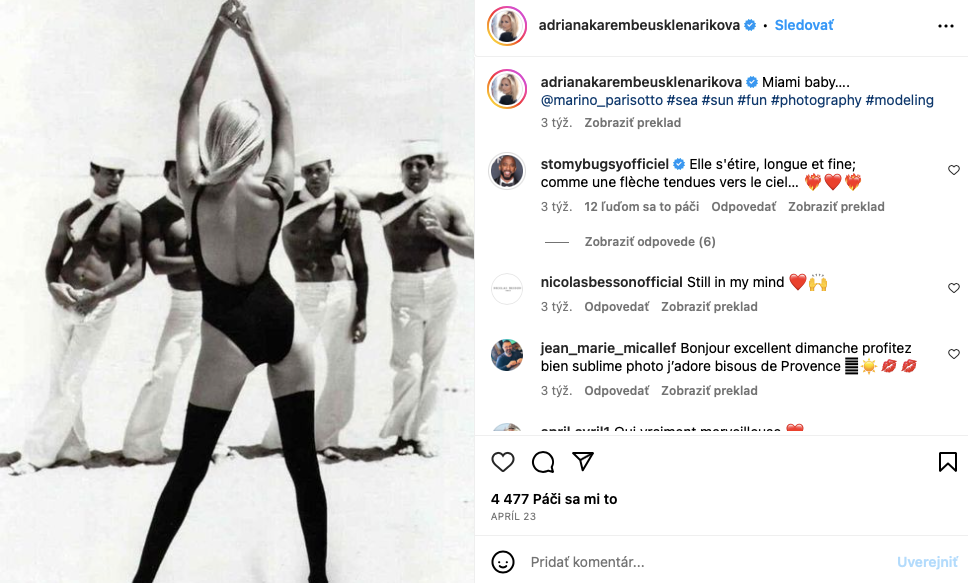 Stomy nešetril horiacimi srdiečkami v komentári pod Adrianinou archívnou fotkou na Instagrame a prihodil aj poetické vyznanie "Ona sa tiahne ako dlhý a tenký šíp natiahnutý k nebu":