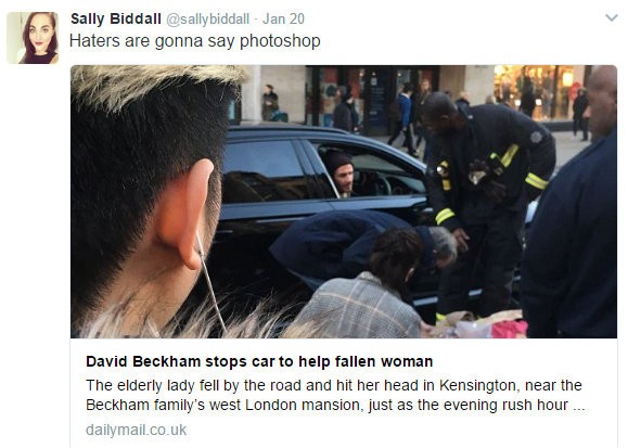Sally Biddal, ktorá celú situáciu videla a bola prvá, kto kolabujúcej žene pomohol, na Twitter napísala: "Pomáhala som starej pani, ktorá skolabovala, keď som mala obedňajšiu prestávku. A hádajte, kto prišiel na pomoc? David Beckham. To je niekto. Aký gentleman!"