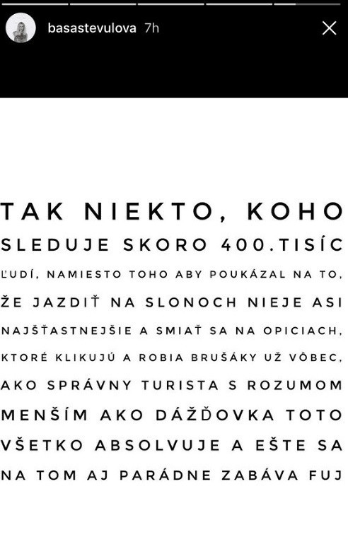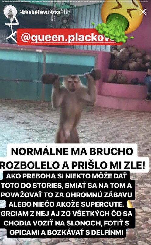 "Normálne ma brucho rozbolelo a prišlo mi zle. Ako si prebohaniekto môže dať toto do stories, smiať sa na tom a považovať to za ohromnú zábavu. Grciam z nej aj zo všetkých, čo sa chodia voziť na slonoch, fotiť s opicami a bozkávať s delfínmi," napísala k videu s cvičiacimi primátmi snowboardistka Baša Števulová.