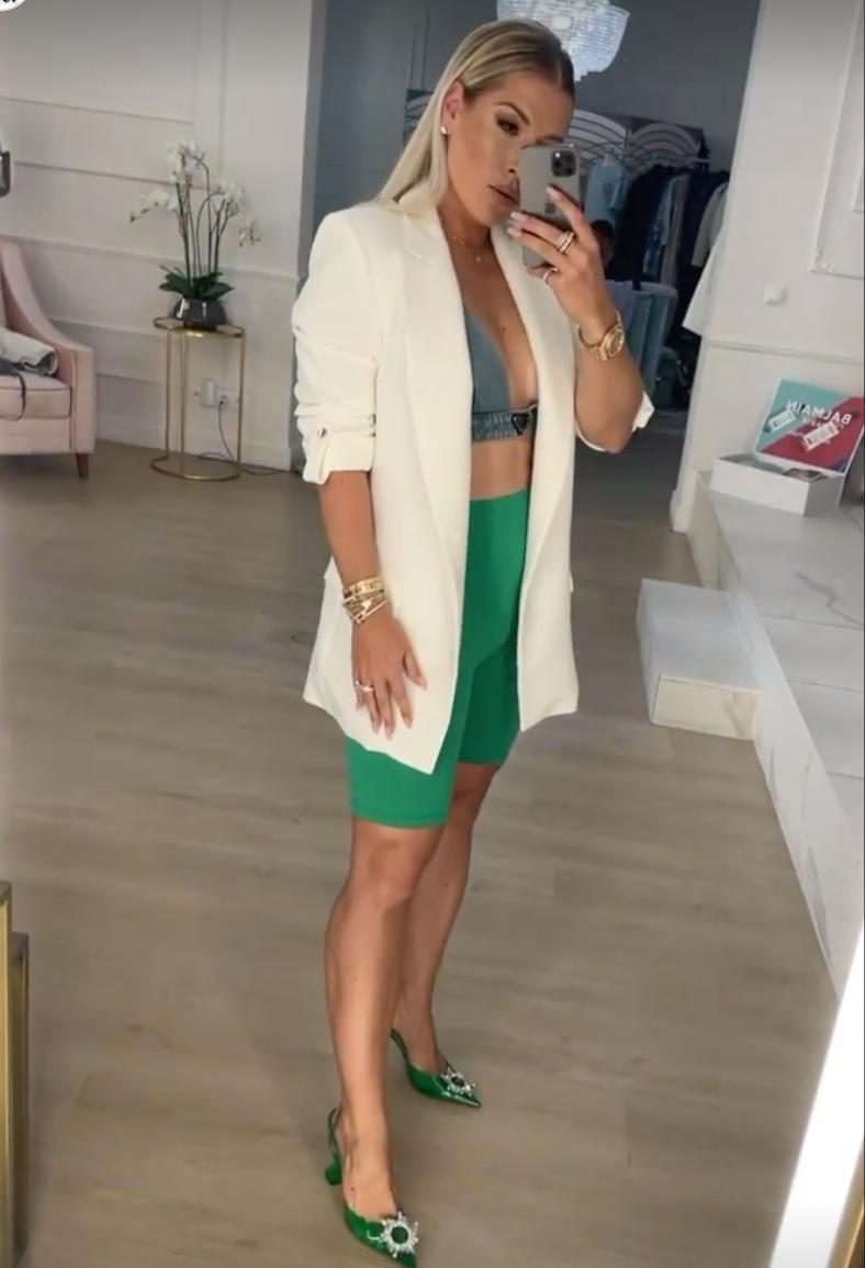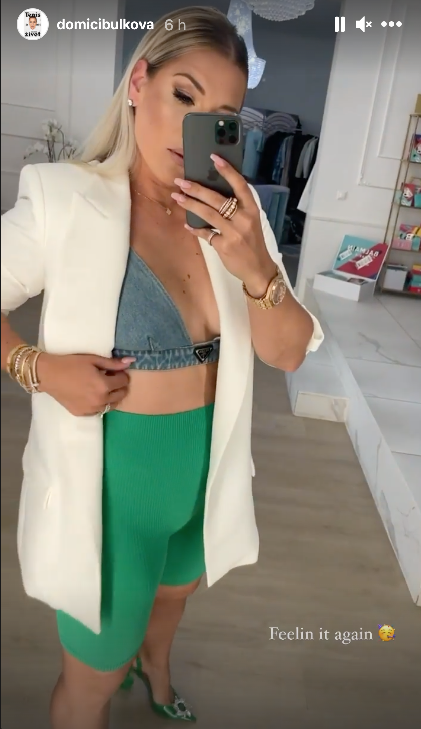 Zelené "elasťáky" po kolená, rifľový podprsenkový top, biele sako a zelené špicaté črievičky s výraznou brošňou. Radšej ani nevedieť, koľko musel tento outfit stáť, no Cibulkovej to skutočne seklo. A ukázala komplet krivky - najmä ploché bruško, na ktoré je evidentne veľmi hrdá a stále na ňom poctivo maká, ako ukázala aj na čerstvej fotke zo stacionárneho bicykla.