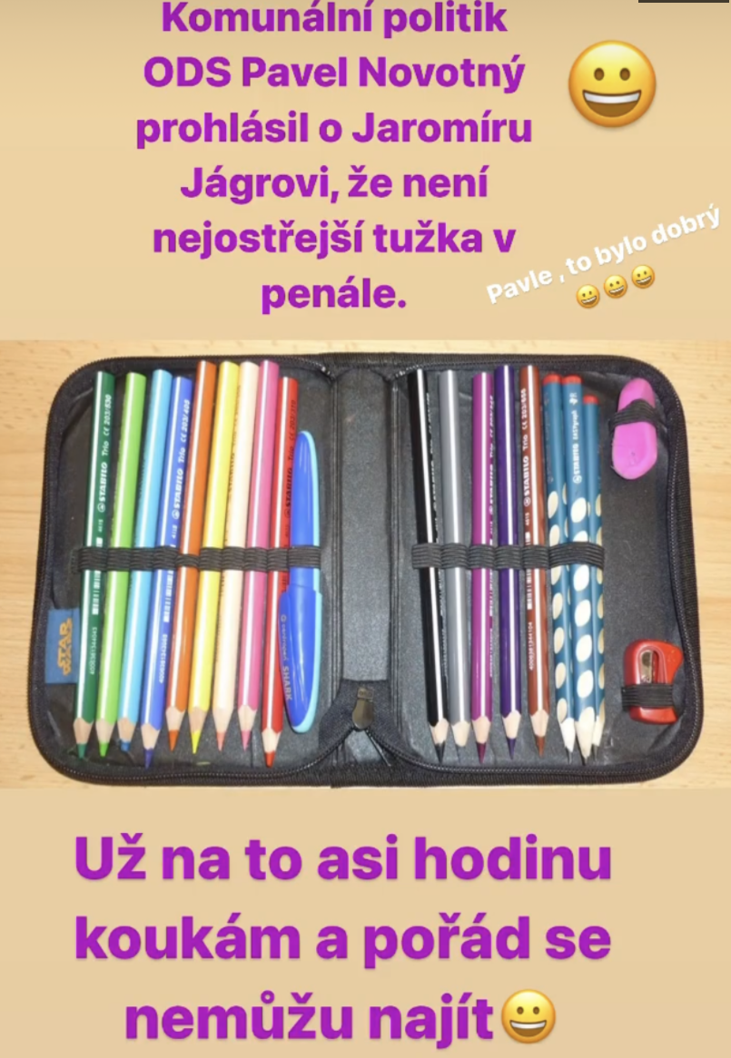 Tým ale Novotný neskončil a ešte si do Jágra kopol: "Jágr, ktorý nie je práve naojstrejšia ceruzka v perančíku, by mal radšej mlčať". Na to sa už ale ozval aj samotný Jarda a zverejnil vtipnú reakciu. "Pavle, to bolo dobré, už na to asi hodinu pozerám a stále sa nemôžem nájsť," napísala hokejová legenda k fotke s peračníkom. Evidentne si z nemiestnych inzultácií komunálneho politika nič nerobí a aktuálne sa radšej oddáva dovolenke so svojou láskou Dominikou.