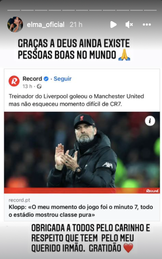 Cristianova sestra Elma, ktorá žije na Madeire, zverejnila emotívne zábery tohto gesta a na sociálnej sieti napísala: "Ďakujem za toto, Liverpool. Nikdy nezabudneme na to, čo ste dnes urobili." Svoju správu zakončila emotikonom srdca. Ďalšia jeho sestra Katia zverejnila svoj príspevok zo svojho domova v Brazílii. "Cesta za hranice futbalu," napísala na pozadie vlastného videa s refrénom piesne "You'll Never Walk Alone". Sestry a ich mama Dolores Aveiro sa v týchto ťažkých chvíľach utiekajú k Bohu, aby im pomohol prekonať tragickú stratu. Dolores citovala na svojom Instagrame v portugalčine známy verš z Biblie, ktorý pomohol mnohým ľuďom prekonať ťažké chvíle: "Dôveruj Pánovi celým svojím srdcom a neopieraj sa o svoj vlastný rozum. Na všetkých svojich cestách ho uznávaj a on bude riadiť tvoje cesty."